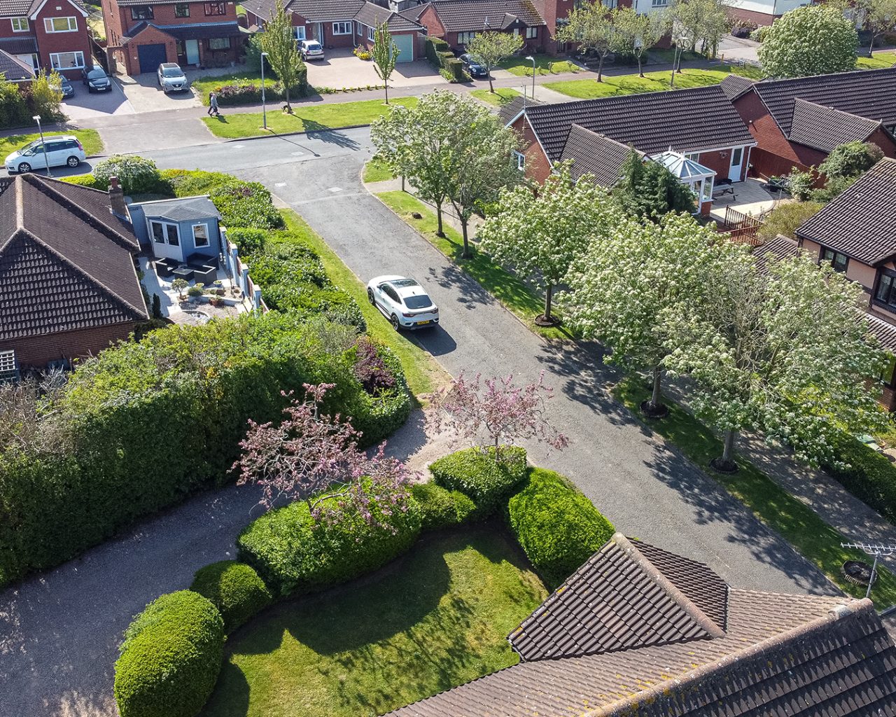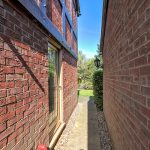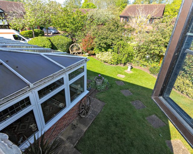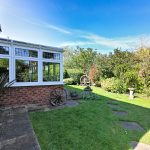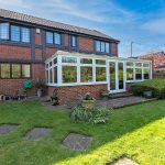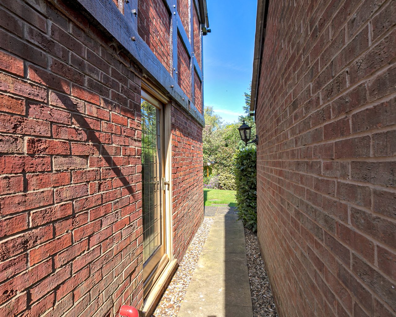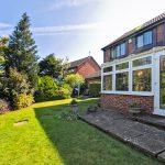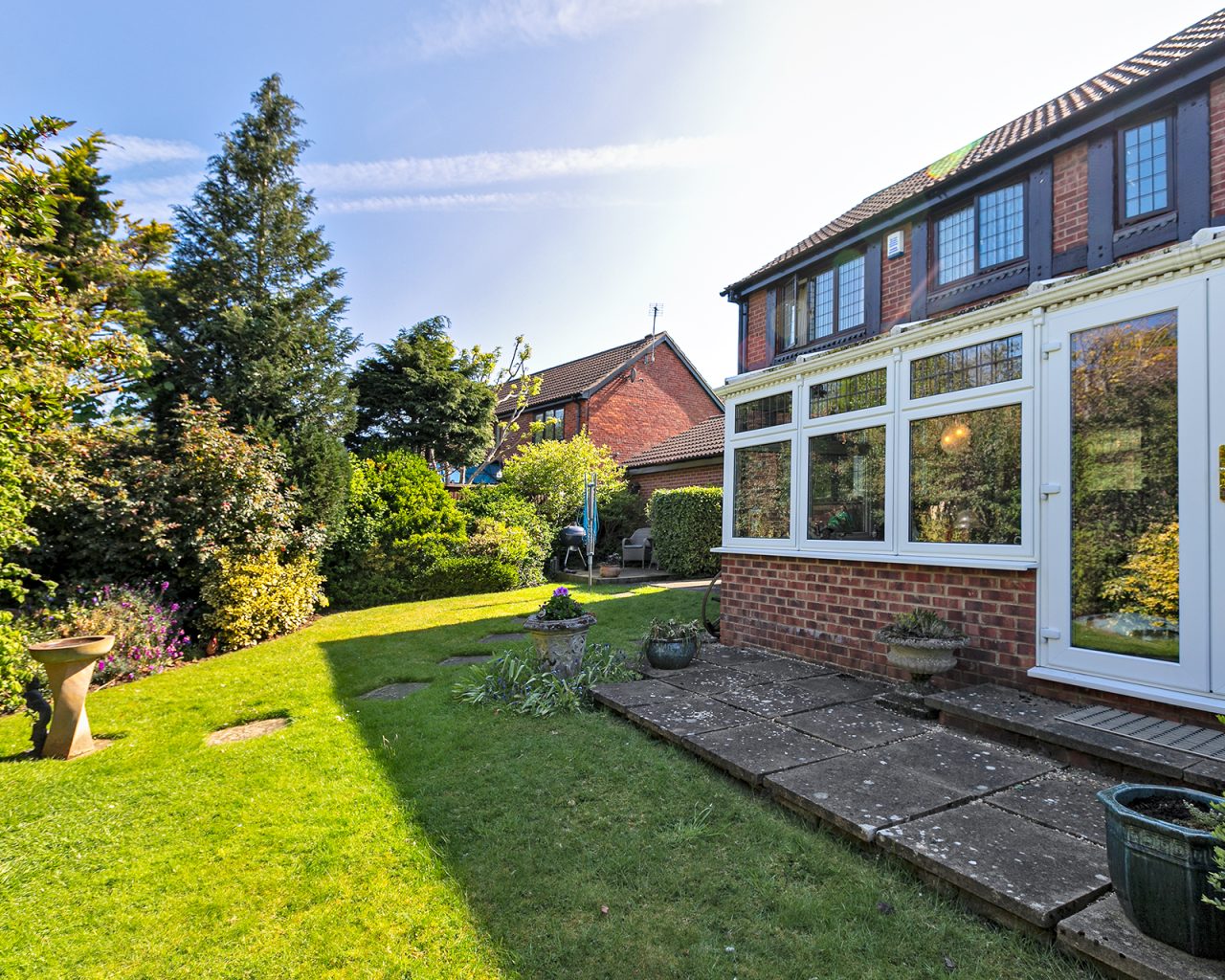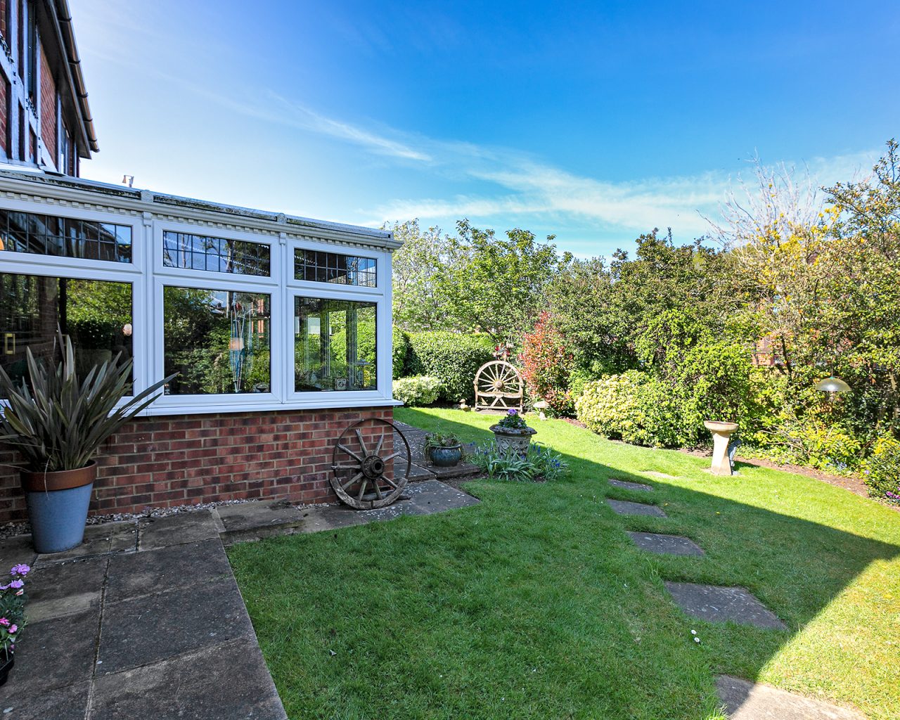 The front provides a large driveway and a lawned area with mature with hedges, a side entrance to the large rear garden.
