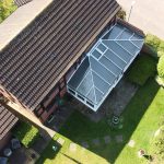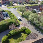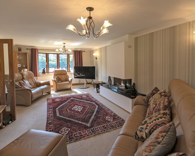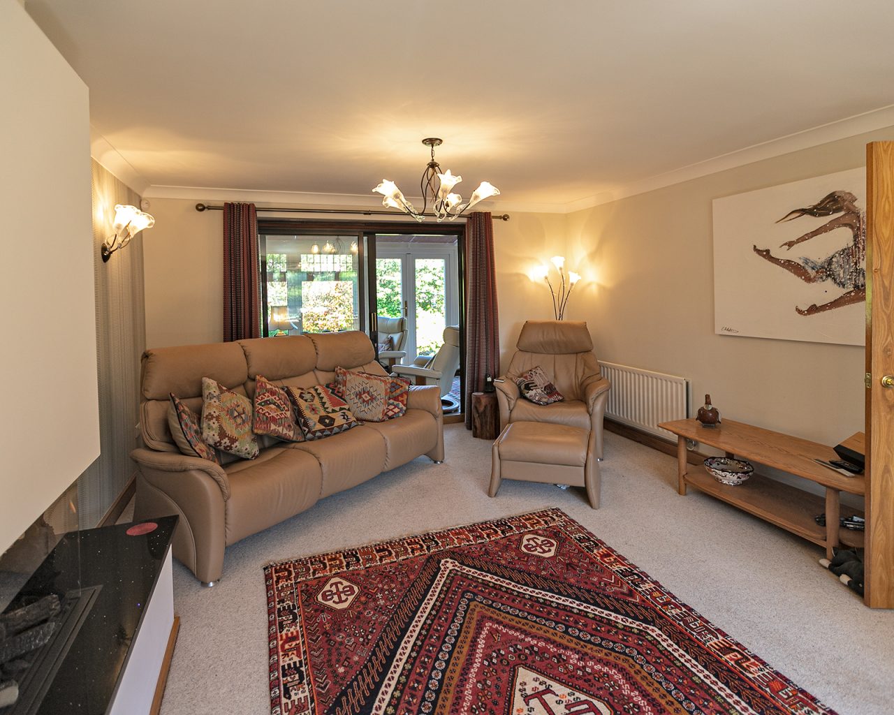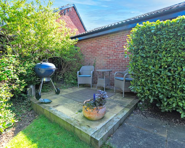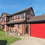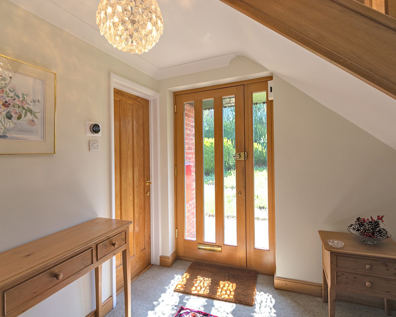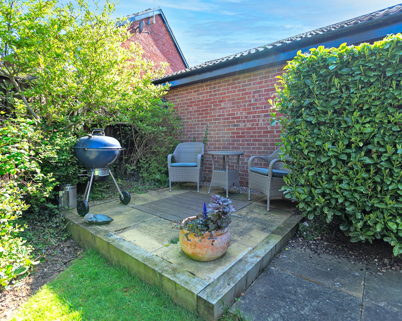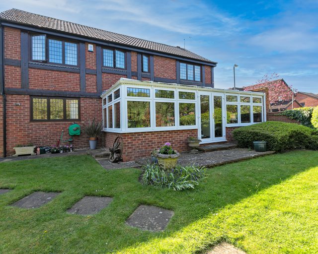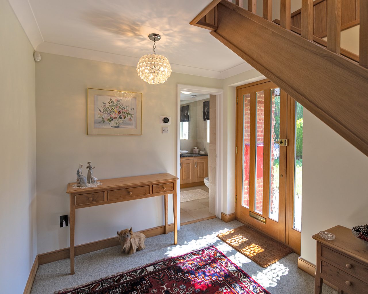 The front provides a large driveway and a lawned area with mature with hedges, a side entrance to the large rear garden.
