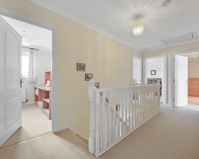 The heart of the home is the open-plan kitchen/breakfast/family room, complete with a breakfast bar, integrated Neff appliances, and a double oven, one of which is a versatile multifunction oven. Adjacent to the kitchen is a practical utility room with direct access to the garden.