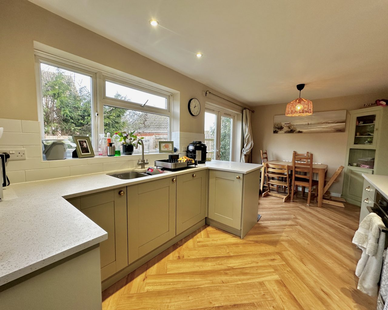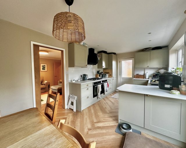 To the rear, the kitchen diner provides a sociable heart of the home, fitted with selected integrated appliances including an oven and hob and a fridge freezer. Double doors open directly onto the garden, creating a seamless flow between indoor and outdoor living—perfect for summer dining and family gatherings.
