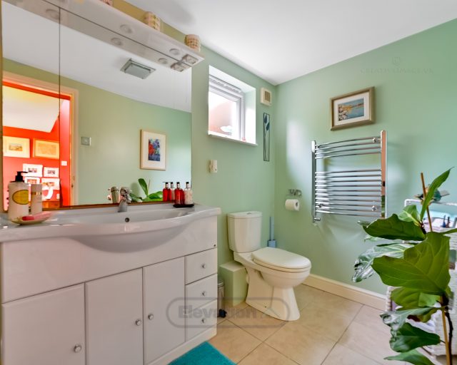 Sealed unit double glazed window to side. Fitted with a white suite comprising low level WC, hand wash basin with storage cupboards below. Chrome towel radiator. Ceramic tiled floor. Fitted unit with large mirror with built in lights / room for shower.