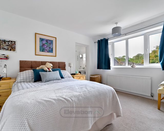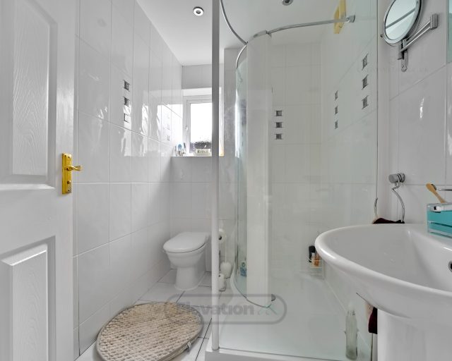 Fitted with a white suite comprising low level WC, pedestal hand wash basin, tiled walk-in shower cubicle with wall mounted shower mixer and glazed screen. Ceramic tiled walls. Ceramic tiled floor. Heated towel rail.