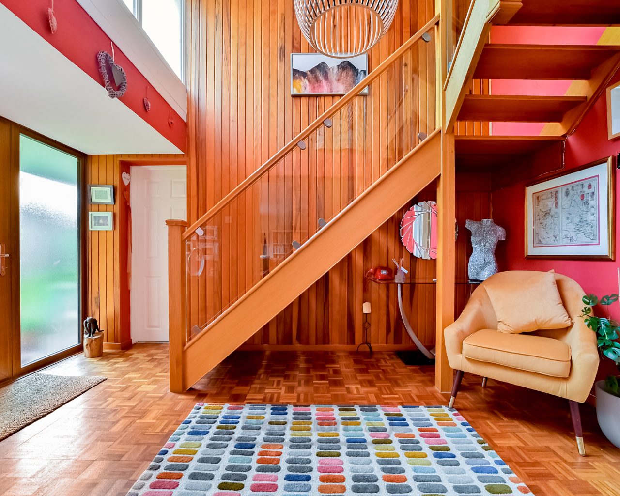 Original parquet flooring. Wooden open tread stairs with glass balustrade to first floor accommodation. Double radiator. Feature wood panelling on walls.