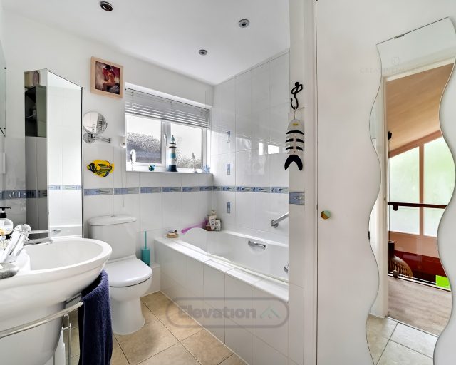 Sealed unit double glazed window to side. Fitted with a white suite comprising low level WC, wall mounted hand wash basin with mixer tap and pop up waste, tiled panelled bath, hand held shower and wall mounted power shower mixer. Chrome towel radiator. Recess ceiling lights. Ceramic tiled floor. Part ceramic tiled walls. Door to airing cupboard with lagged copper cylinder tank. Heated towel rail.
