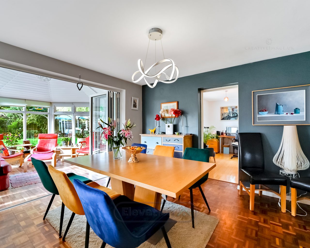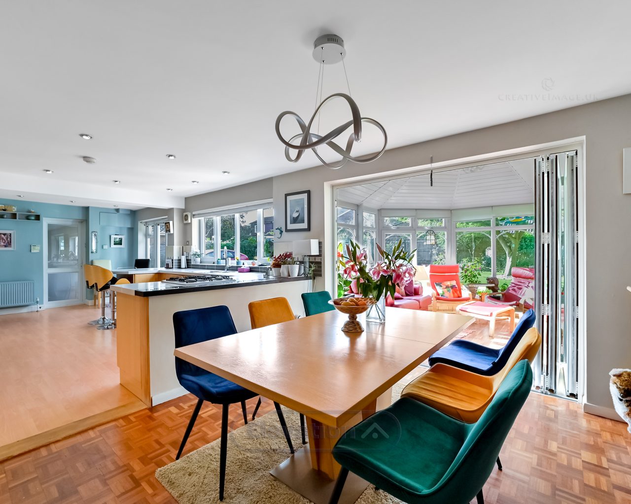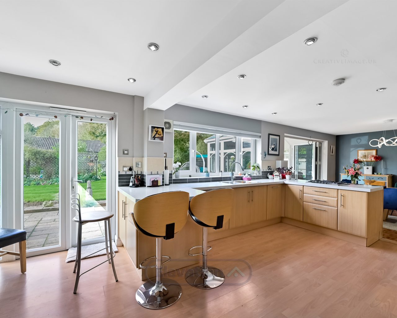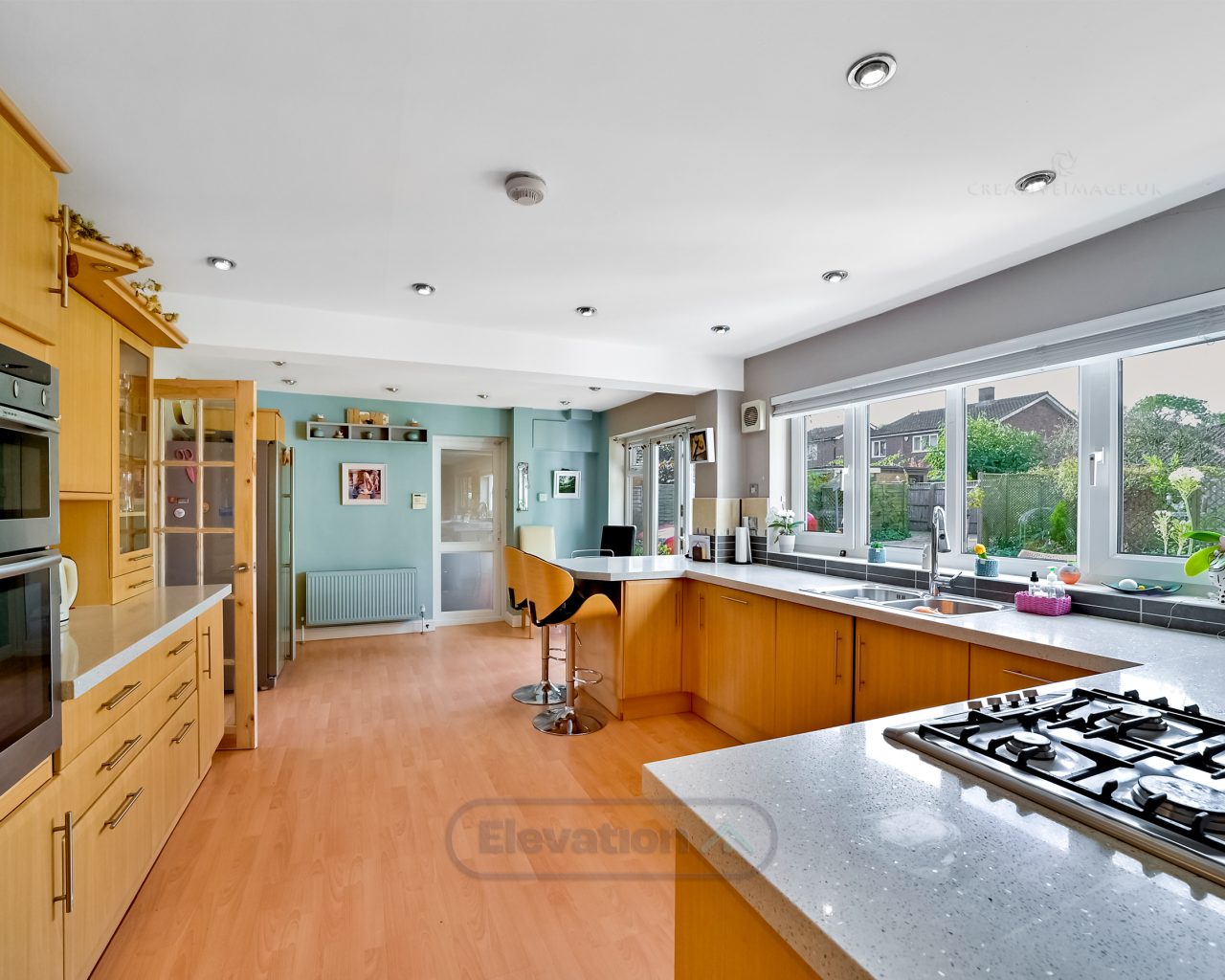 Sealed unit double glazed bi-folding doors to Conservatory. Sealed unit double glazed window to rear. Twin sealed unit double glazed doors opening onto rear garden. Bespoke wooden white blinds. Fitted with a range of wall, base, drawer, tall and glazed units. White granite work tops and breakfast bar. Neff four ring gas hob. Neff fan assisted oven. Double bowl stainless steel sink unit with mixer taps over. Double radiator. Part wood block flooring.
