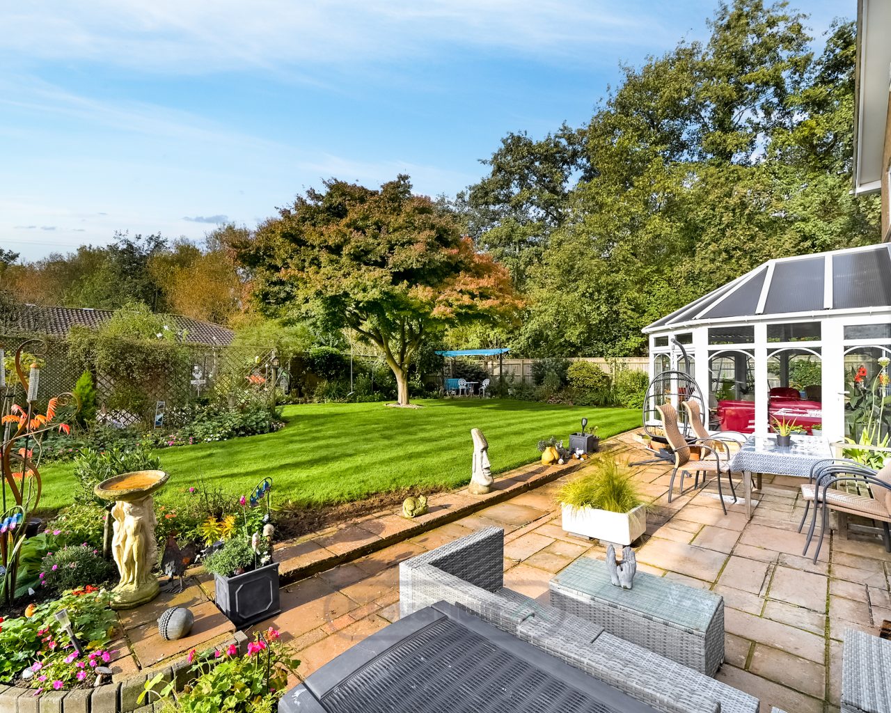 Superb south facing rear garden. Laid to lawn. Comprehensively stocked flower, shrub beds and borders. Paved patio area