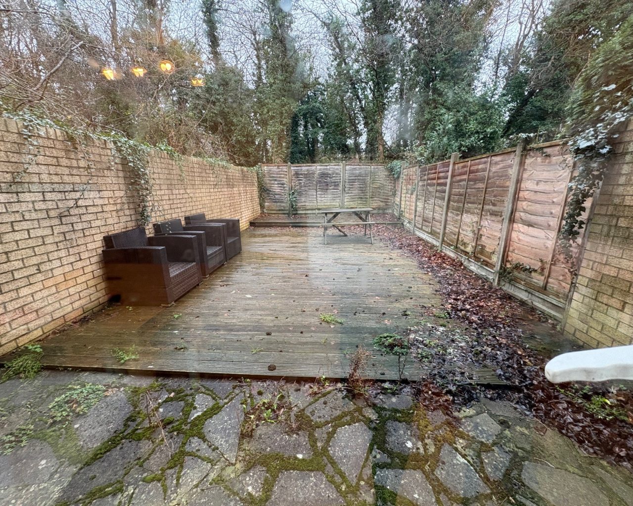 An enclosed low-maintenance garden, with fenced boundaries, part paved and decked, and an internal garage.