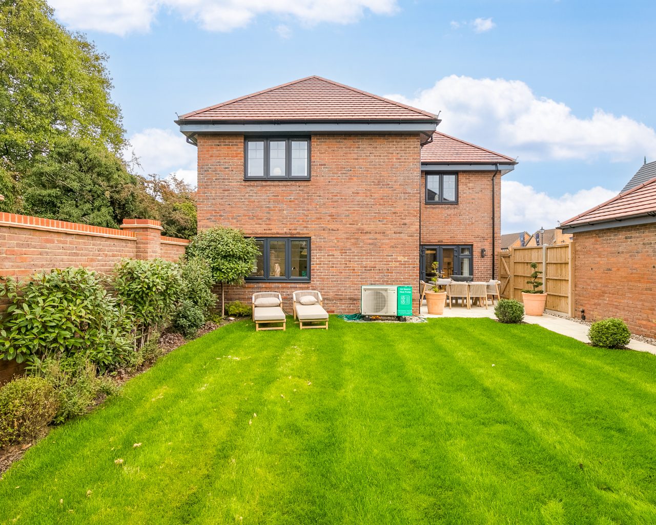 The Hallow achieves an EPC A rating and incorporates sustainable features including a fitted solar panel, an air source heat pump, and an electric vehicle charging point, offering energy-efficient living.