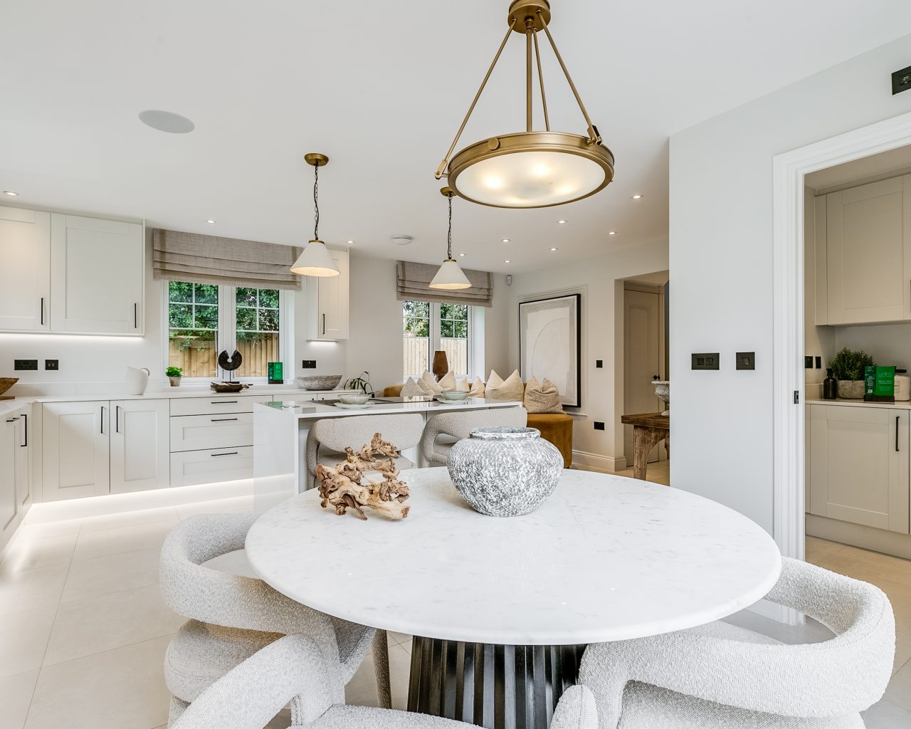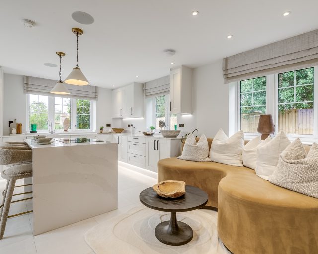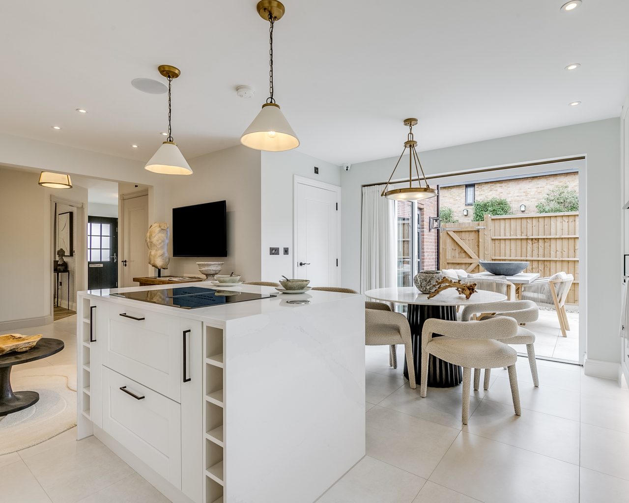 The striking entrance hall creates an immediate impact and leads to a well-balanced ground floor, featuring a private study, to the front of the home is a formal dining room, enhanced by a bay window, and a private living room—ideal for both entertaining and everyday family life. At the heart of the home lies a stunning open-plan kitchen, living, and dining space. Designed for modern living, the kitchen offers extensive storage, sleek cabinetry, and a central island that naturally becomes the focal point of the room. French doors open onto the patio and garden, creating a seamless connection between indoor and outdoor living.