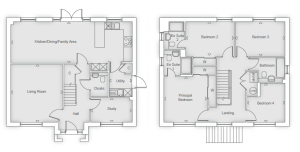 Upstairs, all four bedrooms are spacious doubles. The principal bedroom and bedroom two both benefit from fitted wardrobes and their own en-suite shower rooms, while bedrooms three and four share a beautifully appointed family bathroom, designed with both style and practicality in mind.